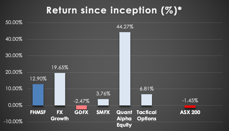 The performance (as at end of December 2020) for the Ferguson Hyams Multi Strategy Fund (FHMSF) and each component strategy is shown below.